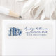 A charming return address shipping label inspired by the “A New Chapter Begins” theme, perfect for a baby shower or bridal shower. On the left side, a watercolor open vintage book is styled in soft shades of blue and white with delicate chinoiserie patterns, accented by subtle wildflowers in muted blue, navy, and soft gray tones for a refined storybook feel.
