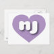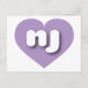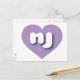 Diese Postkarte besticht durch ein formvolles und lebendiges Lavendelherz mit den fett-, weiß- und abgerundeten Kleinbuchstaben nj, einer spielerischen Abkürzung für New Jersey, den Gartenbauer Staat. Die Rückseite der Postkarte ist leer und wartet auf Ihre handgeschriebenen Stimmungen oder Ihren personalisierten Text.