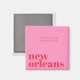 Magnet mit modernen Servietten aus New Orleans mit fett roter Typografie auf einem rosa Hintergrund. Das Wort "New Orleans" wird stylisch in zwei Zeilen in dekorativen Kleinbuchstaben unterteilt, wobei oben für Namen, Veranstaltungstitel oder Party-Themen ein anpassbarer Text steht. Perfekt als anpassbarer Keepake oder Marketing.