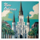"new orleans louisiana travel", "st louis cathedral church", "retro turquoise postcard poster", "jackson square castle usa", "french quarter america tourism", "american houses tourist souvenir", "vintage antique buildings", "famous landmark palm trees", "classic sights sites to visit", "teal blue green sky"