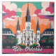 "new orleans louisiana travel", "st louis cathedral church", "retro colorful postcard poster", "jackson square castle usa", "french quarter america tourism", "american houses tourist souvenir", "vintage antique buildings", "famous landmark palm trees", "classic sights sites to visit", "vibrant hot pink orange sky"