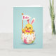 This card features a soft blue background that sets a calm spring setting, with a round yellow baby bird character peeking from a cracked eggshell. The little character has long bunny-like ears with pale pink inner details, and its wide dark eyes and rosy cheeks give it a tender, friendly look 🐰. A magenta bow tie sits neatly at its neck, adding a sweet, dressed-up touch beside its open beak shaped into a smile. The eggshell below acts like a cozy cradle, decorated with tiny long-eared figures and scattered colorful shapes that suggest a festive day. In one small wing, it holds a white pennant flag where the word “Easter” appears in bright pink lettering near the center of the flag 🐇. Soft, diffused lighting creates gentle shadows under the shell and along the character’s rounded body, giving the scene a lightly dimensional feel. The overall palette blends yellow, pink, and blue in smooth transitions that keep the focus on the character and its flag. The cracked shell shows jagged edges with patterned sections wrapping around the lower half.