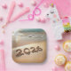 Year "2026" are etched into smooth sand as gentle ocean waves approach the shoreline, illuminated by the warm glow of the sun