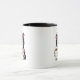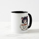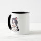 With messy fur, tired eyes pointing in different directions, and a playful expression, the cat holds an oversized coffee