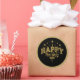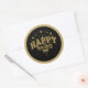 This round sticker is shown with a Happy New Year stars print with a gold faux glitter border.