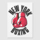 Das Bild zeigt ein Paar roter Boxhandschuhe, positioniert in einer klassischen Kampfhaltung, mit den Worten "NEW YORK BOXING" in fett schwarzer Schrift umrahmt. Die Handschuhe sind mit weißen Akzenten und gelben Schnürsenkeln detailliert, was dem Design eine Touch Realismus verleiht. Der Hintergrund ist schlicht weiß, sodass sich das kräftige Rot der Handschuhe und der fette schwarze Text auffallen lassen.