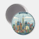 Eine Illustration New Yorks zeigt die majestätisch aufsteigende Skyline im Hintergrund, zeigt Sehenswürdigkeiten wie das Empire State Gebäude und erinnert an die Dynamik und den zeitlosen Reiz der Stadt.