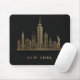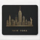 Eine saubere und elegante grafische Abbildung mit der ikonischen Skyline von New York City. Wichtige Sehenswürdigkeiten wie das Empire State Gebäude und die Freiheitsstatue werden in einem minimalistischen, goldenen Linien Kunststil dargestellt. Der Text "NEW YORK" wird in einem passenden goldenen Schriftart unterhalb der Stadtmauer geschrieben. Das Design ist Set auf einem soliden, dunkelgrauen Hintergrund und schafft eine moderne Ästhetik.