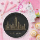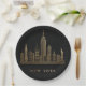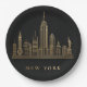 Eine saubere und elegante grafische Abbildung mit der ikonischen Skyline von New York City. Wichtige Sehenswürdigkeiten wie das Empire State Gebäude und die Freiheitsstatue werden in einem minimalistischen, goldenen Linien Kunststil dargestellt. Der Text "NEW YORK" wird in einem passenden goldenen Schriftart unterhalb der Stadtmauer geschrieben. Das Design ist Set auf einem soliden, dunkelgrauen Hintergrund und schafft eine moderne Ästhetik.