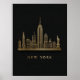 Eine saubere und elegante grafische Abbildung mit der ikonischen Skyline von New York City. Wichtige Sehenswürdigkeiten wie das Empire State Gebäude und die Freiheitsstatue werden in einem minimalistischen, goldenen Linien Kunststil dargestellt. Der Text "NEW YORK" wird in einem passenden goldenen Schriftart unterhalb der Stadtmauer geschrieben. Das Design ist Set auf einem soliden, dunkelgrauen Hintergrund und schafft eine moderne Ästhetik.
