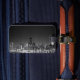 Dieses Schwarzweiss-Foto der feinen Kunst kennzeichnet eine klassische, timeless Ansicht des New York Cityskyline nachts. Die Wolkenkratzer und die Gebäude von Midtown Manhattan stehen heraus im Gegensatz zu dem glatten Wasser des East Rivers, der die Lichter vom Cityscape reflektiert.