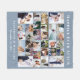 Eine speziell für Jungvermählte gefertigte, blaue Halsbettdecke mit einer 30-Foto-Collage aus Verlobung, Hochzeitstag, Brautparty, Trauzeugen, Familie, Flitterwochen, etc. und "Happily Ever After", Ihren Namen und Ihr Hochzeitstag in eleganter weißer Serifentypografie.