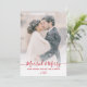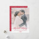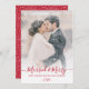 Elegante moderne Red Script Newlyweds Foto Verheiratet und frohe Weihnachtskarte. Dieses einfache festliche minimalistische whimsical (1) ein Foto Urlaub Grußkarte Vorlage zeigt "Verheiratet und Merry" Grußtext ist in einem schönen handgeschriebenen Wirblen Swash-Schwanz-Schriftart Kalligraphie oder Typografie rotes Skript, Ehername und Jahr auf Weiß-Gradient-Foto-Overlay geschrieben. Auf der Rückseite schneebedecktes oder schneeflockenes Muster auf rotem Hintergrund. Hübsche Grußkarte für Ihre Familie und Freunde in der Weihnachtszeit.
