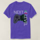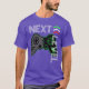 A sleek, high-tech graphic illustration of a video game controller silhouette, split vertically into dark grey and deep black halves. The design features a vibrant, glowing neon green outline that makes the controller stand out against the clean background. The word "NEXT" is styled in a modern, striped linear font at the top, accompanied by three chevron arrows in neon green, white, and red, signifying growth and progression. Abstract white geometric line patterns flow across the right side, giving the entire design a fast-paced, digital esports aesthetic perfect for gaming enthusiasts.