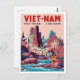 Escape to the stunning coastline of Vietnam with this dramatic vintage travel poster style postcard featuring Nha Trang and Cam Ranh. The design showcases a striking landscape of rugged, reddish-pink rock formations, vibrant palm trees, and clear blue waters, with a figure in traditional yellow and red attire. The bold, contrasting colors and graphic style give the scene a powerful, retro-exotic feel. This postcard is perfect for celebrating the beautiful beaches and unique geology of Southeast Asia, decorating with retro art, or sending a memorable greeting from this tropical destination.