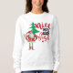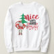 Hier ist ein niedliches Holiday Shirt mit einem lustigen Cartoon Santa stehend mit seinen Händen auf den Hüften. Hinter ihm steht ein grüner Weihnachtsbaum. Neben den Bildern ist stilisierter Text, der "Nice Bis Proven Naughty" in rot und schwarz sagt.