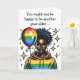 Eine Geburtstagskarte für einen queen, homosexuellen, lesbischen oder transgender Freund oder Partner. Eine lustige Karte mit einer afroamerikanischen Lesbe oder Trans-Frau, die einen Regenbogenballon mit einem verrückten Gesicht hält.