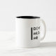 Weiße Tasse mit schwarzer Beschriftung.