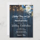 Eine elegante Einladung zur Hochzeit mit eleganter Kalligrafie, ergänzt durch wunderschönes blaues Holz, grüne Saitenleuchten und weißblaue Blumen mit goldenem Glitzer. Sie können diese Karte mit Ihren Angaben zur Hochzeit personalisieren.
