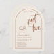 Eine elegante und moderne, erdfarbene, bogenförmige Hochzeitseinladung, die minimalistischen Text mit einem handgeschriebenen Schriftzeichen-Akzent in der Phrase "nichts extravaganter nur Liebe" enthält. Auf einem cremefarbenen Hintergrund mit Terracotta-Text und Designelementen, aber alle Elemente können nach Ihrem Thema neu gefärbt werden. © Kimbellished, LLC