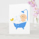 Niedlicher kleiner Druck für eine Babydusche. Kleiner kleiner Junge sitzt in einer blauen Badewanne mit Blasen und seinem Gummifick.