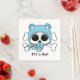 Niedlicher Baby-Boy-Schädel und Kreuzknochen mit blauer Hut, Schnuller und Es ist ein Junge!-Text.