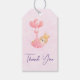 Geschenketiketten mit einer anmutigen Abbildung eines kleinen braunen Babybastes mit einer winzigen goldenen Krone. Von Ballons in einer rosa Herzdecke getragen.