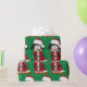 Weihnachtsfeiertag Bernedoodle Welpen Hund mit doodle-kritzeln Effekt Santa Anzug und Weihnachtsmannmütze halten Bonbons Stock in seinem Mund. Niedliche Weihnachtsverpackung für Bernedoodle Liebhaber! Urlaub Grün und Schnee Hintergrund!