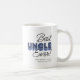 Leckerei eines Onkels zu dieser personalisierten Kaffee-Tasse mit dem Sprichwort "Bester Onkel je" in einem eleganten Drehbuch & kühnen blauen Blase-Schriftart, und die Kindernamen darunter.