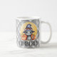 Halloween-Tasse mit einer skurrilen, schwarzen Katze in einem Hexenhut, Kürbissen und grauem kariertem Hintergrund. Persönlich mit einem Namen für ein lustiges saisonales Geschenk oder gemütlichen Trinkbehälter für Oktober.