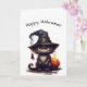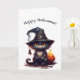 Niedliches schwarzes Kätzchen mit Hexenhut neben einer lächelnden Jack-o'-Laterne.
