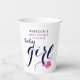 Diese niedliche Papiertasse für eine Babydusche zeigt eine charmante Kombination aus fuchsienrosa und marineblau. Die Typografie "Baby Girl" ist elegant in marineblau dargestellt, während ein wunderschöner Fuchsienwal spielerisch Herz sprüht. Um eine persönliche Touch hinzuzufügen, enthält die Tasse auch den Namen der künftigen Mutter, was sie zu einer perfekten Ergänzung zu jeder Babydusche-Feier macht.