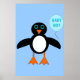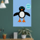 Dieses Poster zeigt einen niedlichen Cartoon eines blauen Pinguins mit blauen Augen, einem kleinen orangefarbenen Schnabel und einem weißen Bauch. Der Pinguin hält einen pulverblauen Ballon. Es ist blass blauer Text im Ballon, der sagt: "Baby Junge". Das ist das perfekte Geschenk, um einen Neugeborenen zu feiern.