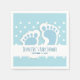 Papierservietten mit einem charmanten Bild der Fußabdrücke des blauen Babys mit einer schweren weißen Kontur. Weiße Polka zeigt einen babyblauen Hintergrund hinter der Abbildung. Ein weißer Streifen, der oben platziert ist und in dem sich der Text befindet.