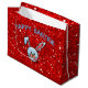 Eine niedliche Ostergeschenktüte mit rotem Glitzer im Hintergrund (nur bedruckt) und einem extrem niedlich blauen Hasen auf Vorder- und Rückseite. Über dem Kopf des Kaninchens liegt der traditionelle Ostergruß von "Happy Oaster". Das wäre eine tolle Geschenktasche, um den Kindern in diesem Jahr ihre Ostereier zu präsentieren, während sie das niedliche Sonnengesicht Liebe geben.