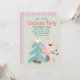 Diese individuelle Weihnachtsfeier-Einladung enthält eine niedliche, gürtelhafte Cartoon-Illustration. Ein hübsch rosa Einhorn schmückt ihren Weihnachtsbaum unter fallenden Schneeflocken. Der Hintergrund ist eine weiche, schlanke grüne Farbe.