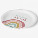 Niedliche Boho Rainbow Pink Geburtstagspapier-Teller verfügen über ein bezauberndes Duo aus Regenbogen in Rosa-, Rost-, Senf-, Aqua- und Marinetönen, zusammen mit moderner Kalligraphie.