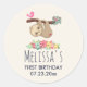 Personalisierte Aufkleber zum Geburtstag oder zur Babydusche mit einer Abbildung eines niedlichen braunen Schwanzes, der auf dem Kopf hängt. Dieser lustige kleine Typ hält an einem Ast fest, der auf der einen Seite einen kleinen rosa Vogel und auf der anderen Seite einen Rosenbuket im Doodle-Stil hat. Unter ihnen ist eine Anordnung von bunten, handgezeichnet Blume. Dieser bezaubernde Faultier hat auch rosa rosa, rosa Wangen und 3 niedliche kleine Herzen auf seinem Hintern.