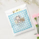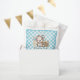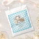 Nutzen Sie diese passenden Dankeschön-Taschen für die Leckereien Ihrer Gäste. Niedlicher brauner Teddybär auf dem Baby-Blau-Weiß-Karo-Muster mit Picknickkorb, Hasen und Schnuller. Vorlagen.