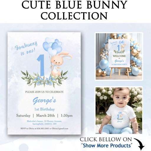 Niedlich Bunny Blue Greenery 1. Geburtstag Junge Einladung