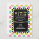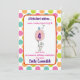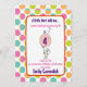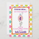 Eine Einladung zum niedliche Geburtstag mit einem skurrilen Hasen, der einen großen rosa Ballon in der Luft hält. Ein kleiner Blauvogel steht auf dem Ballon und pfeift eine Melodie mit kleinen, in der Luft hängenden Liednoten. Set auf einem mehrfarbigen Polka dpt Hintergrund.