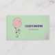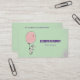 Visitenkarten mit einem skurrilen Hasen, der einen großen rosa Ballon hält, der in der Luft nach oben treibt. Set auf hellgrünem Hintergrund.