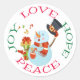 Dies ist ein niedlicher Aufkleber für den vielseitigen Einsatz während der Ferienzeit. Es zeigt ein Cartoon von einem kleinen Schneemann, der seinen Hut hochhebt und sein Herz aussingt. Neben ihm ist ein Stapel von hell umhüllten Weihnachtsgeschenken. Das Bild wird durch den Text Liebe Hope Peace Joy in rot und grün umgeben.