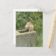 Niedlicher Chipmunk mit vollen Wangen, die von einem Zementblock in einem Garten aus beobachten.