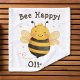 Dieses personalisierte Kids-Waschlappen zeichnet sich durch eine fröhliche, würfelige Hummel mit kühnen braunen und gelben Streifen, ein großes Lächeln Gesicht, rosige Wangen und winzige Flügel aus. Die spielerische Biene bläst mit einem kleinen Weg dahinter und verbreitet Glück. Oben steht der Satz "Bee Happy!" in einem lustigen Schriftart.