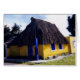 Cozumel Architektur, die wie Volkskunst aussieht, mit lebhaftem Gelb und Blau in einer abseits gelegenen Lage in der Yucatan Halbinsel von Mexiko. Einige Familien haben viel Mühe darauf verwendet, diese Zuhause mit Strohdach so charmant wie möglich zu machen. Die Türrahmen und Fensterrahmen sowie ein Pfosten an der weit links Vorderwand sind mit volkstümlichen Kunstprojekten in lebhaften Primärfarben bedeckt.