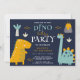 Niedliches Dino Party 1. Geburtstagseinladung für Jungen oder Mädchen, mit einer bunten prähistorischen Dino-Weltszene. Eine auffällige Schrift mit farbigen Orangen-, Blues- und Weißtönen. Auf der Rückseite des Raumes befindet sich ein dunkler Hintergrund mit einem großen Dinosaurier. Geben Sie den Namen und das Party Ihres Kindes ein. Lebhafter moderner Kinderstil.