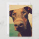 Ein niedliches und lustiges Foto in der Nähe eines neugierigen und neugierigen Doberman Hundes, mit einer großen braunen Nase, sanft braunen Augen und natürlichen Floppy Ohren. Foto hat sich angeschlagen, um ihm eine alte nostalgische Qualität zu verleihen. Personalisieren Sie mit Ihren Kindern Geburtstag Party Details.
