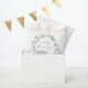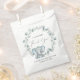 Niedliche Babyduschgebeutel mit "A Sweet Little Danke" in einer Mischung aus moderner Typografie und einem stilvollen Drehbuch mit einem Herzschlag und einer Aquarellfarbe eines pastellblauen Babyelefanten in einem Kranz von Salbeigrün Eukalyptus. Persönlich mit dem Namen der Mutter und dem Datum der Dusche.