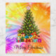 Niedlich dekorierter Weihnachtsbaum mit bunten Geschenken auf farbenprächtigen Feuerwerk-Hintergrund, mit Text...Frohe Weihnachten... Sie können einfach mit Ihrer Textauswahl personalisieren.